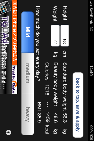 Then, you are weighed. Please set the height. Please set the hardness of the activity of every day. Then, ・BMI ・Standard body weight ・Model body weight ・Necessary calorie Four of the above-mentioned are displayed.