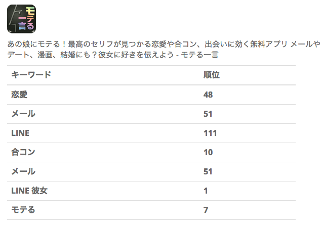 ただし、検索はお気に入りに追加できるので、毎日手動で見てもらえれば推移が分かります。 たとえば、こんな感じのURLになっています。 http://aso.actcat.jp/ranking/result?id=618059797&word=%E3%83%A2%E3%83%86%E3%82%8B+%E5%BD%BC%E5%A5%B3