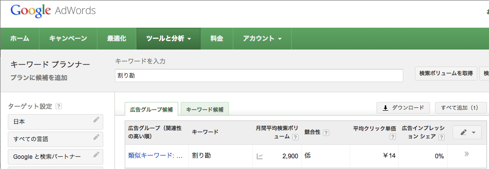 また、各キーワードがどれぐらい検索されているかを類推するには、Google Adwords キーワードプランナーがオススメです。「割り勘」は月間平均検索ボリュームが2,900と大変低いです。家計簿は74,000です。大きめですね。