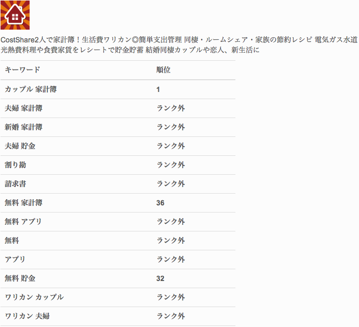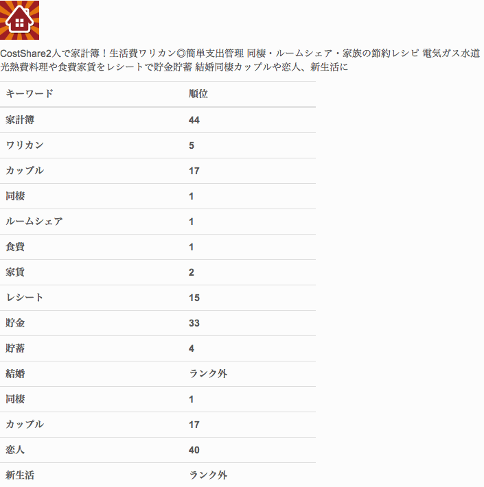 同棲やルームシェア、食費、家賃、同棲などで1位ですね。ワリカンでも上位です。家計簿などビッグワードではほぼ検索結果に表示されていないであろう状態です。